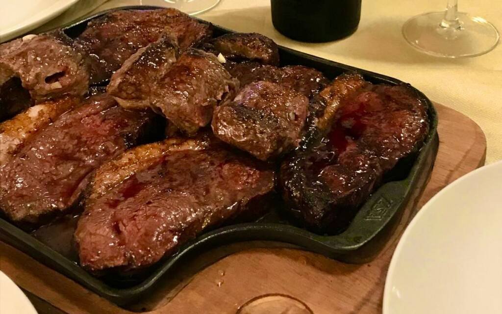 È un piatto pensato per essere condiviso: arriva in tavola con tutta la sua presenza, tagliata al momento per valorizzare consistenza e succo naturale della carne.